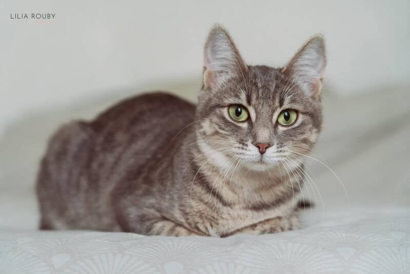 Cette joueuse chatoune à la robe tigrée et aux beaux yeux verts s'appelle Grisette, jusqu'à ce que vous donniez son nom d'amour à cette ronron-machine de foyer heureux ! Vous ne pourrez pas dire que nous vous l'avons signalé silencieuse ; c'est une vraie berceuse ambulante, idéale pour s'endormir avec elle !
