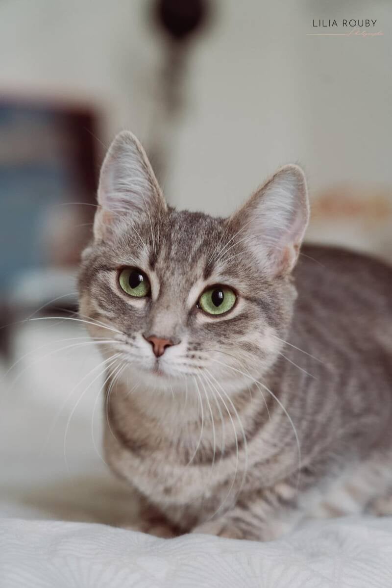 Née en mars 2023, Grisette est une chatonne de 8 mois timide au premier abord, mais qui se montre vraiment affectueuse une fois en confiance. Elle a besoin qu’on lui consacre du temps, ou à défaut, d’avoir un copain chat très câlin avec elle.